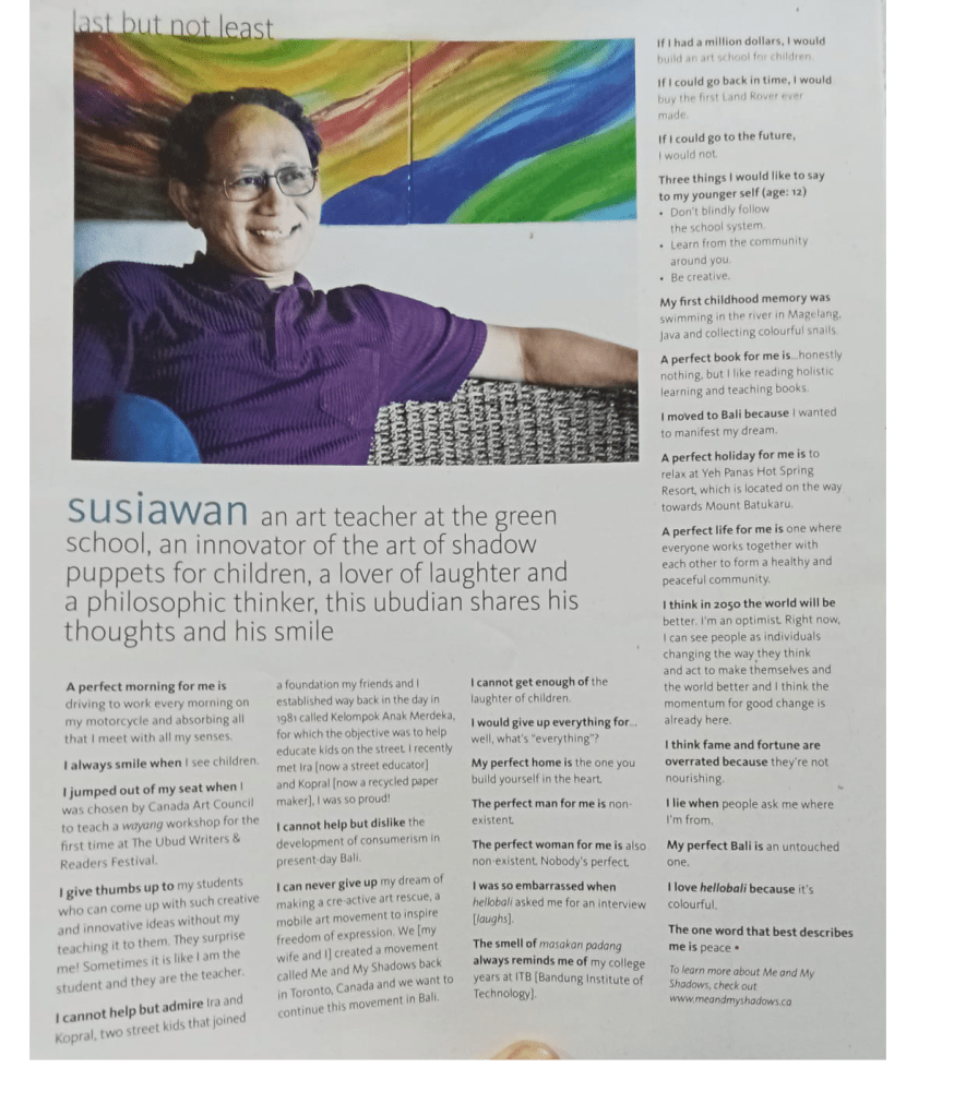 He worked as the main art teacher for early years to high school at Green School Bali and pioneered lessons on natural dye batik painting, mask creation, arts for sustainability and Balinese ritual arts (2009 – 2011).